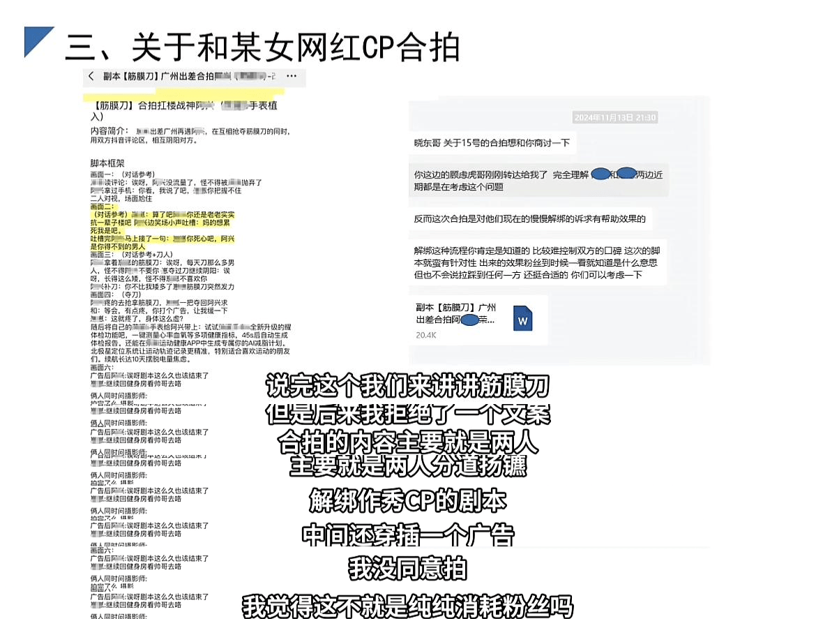 据刘某东透露,他之所以拒绝两人的CP,并不是因为两人的感情,而是因为剧本。对方公司发来相关的文案,要求崽崽与阿兴上演分手的剧本,中间穿插广告,但他认为那是在消耗粉丝,所以便没有同意。