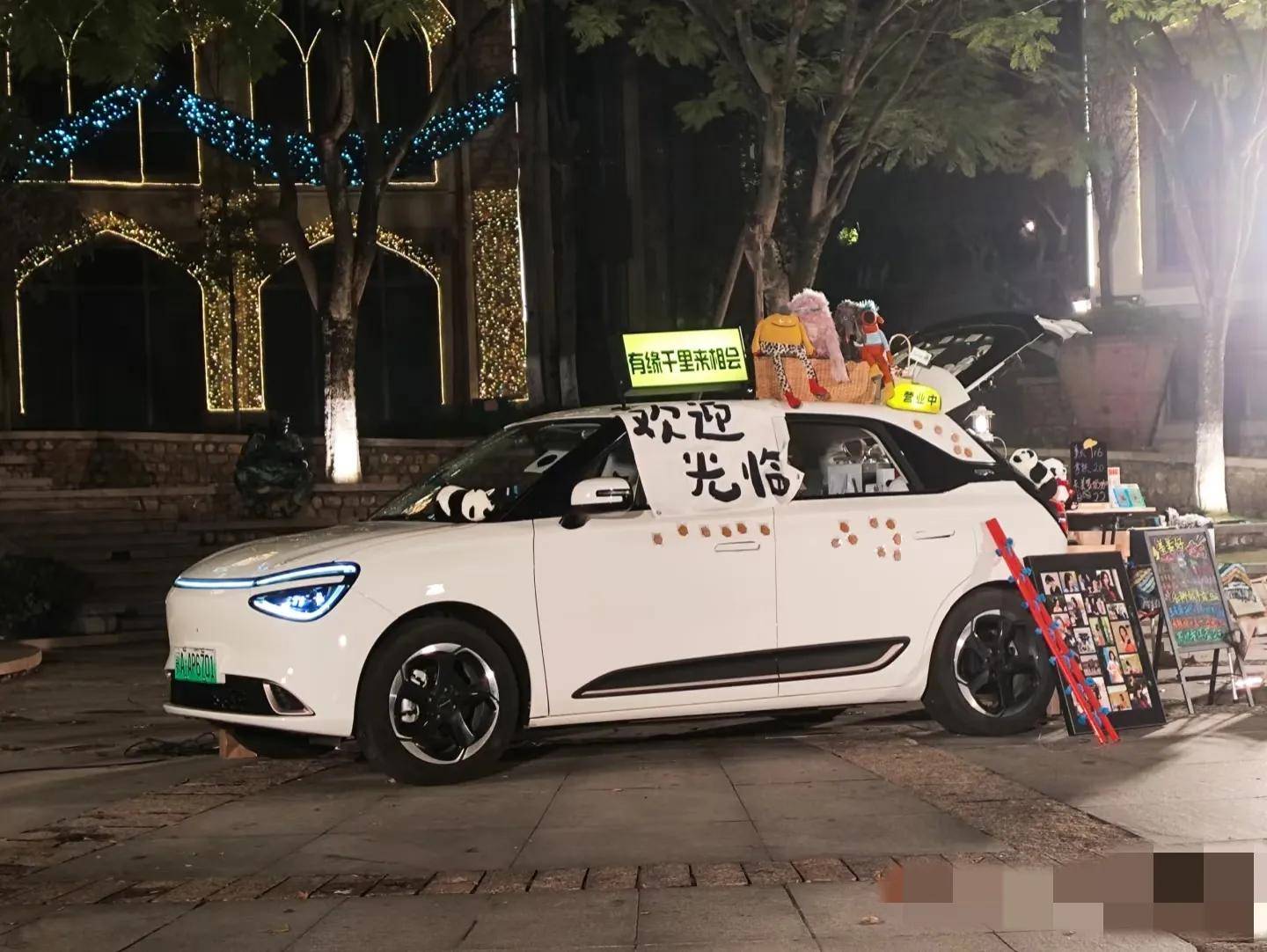 卖东西的小车很有看头,手写的“欢迎光临”,外加“有缘千里来相会”的灯牌,他们这一回摆摊费了不少心思。