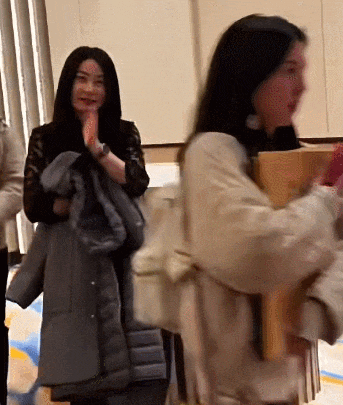 这次俩人同框,何超琼双手自然下垂,显得很松弛;晶晶倒是把手绷得直直的,看上去有点小紧张,不过这样就更可爱了↓