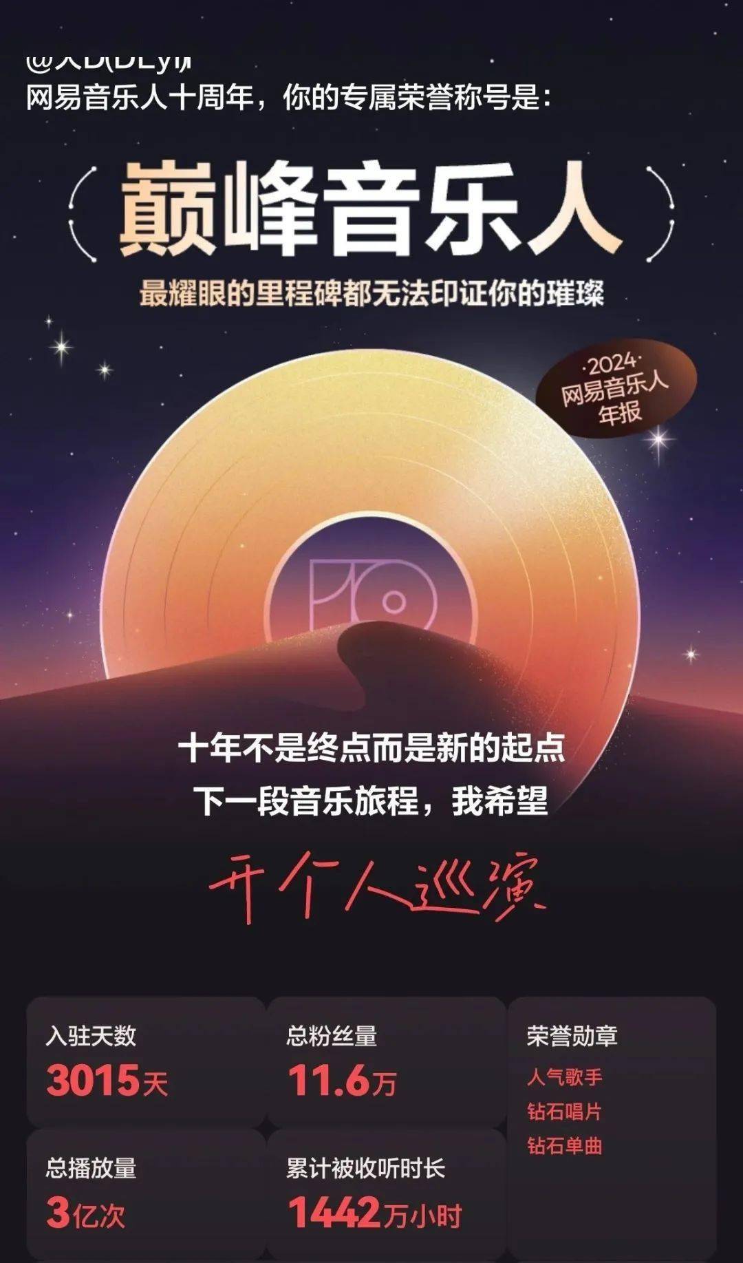 说唱歌手 大DLyn也晒出了自己的 3亿播放量!还表示下一段音乐旅程是 希望开个人巡演!