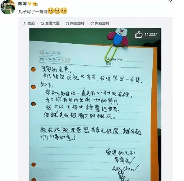 不仅仅是这一次,就连在2015年父亲节的时候,儿子陈尊佑更是给陈坤写了一首诗送给了陈坤,信中更是直言说爸爸一直都是自己心目中的英雄。