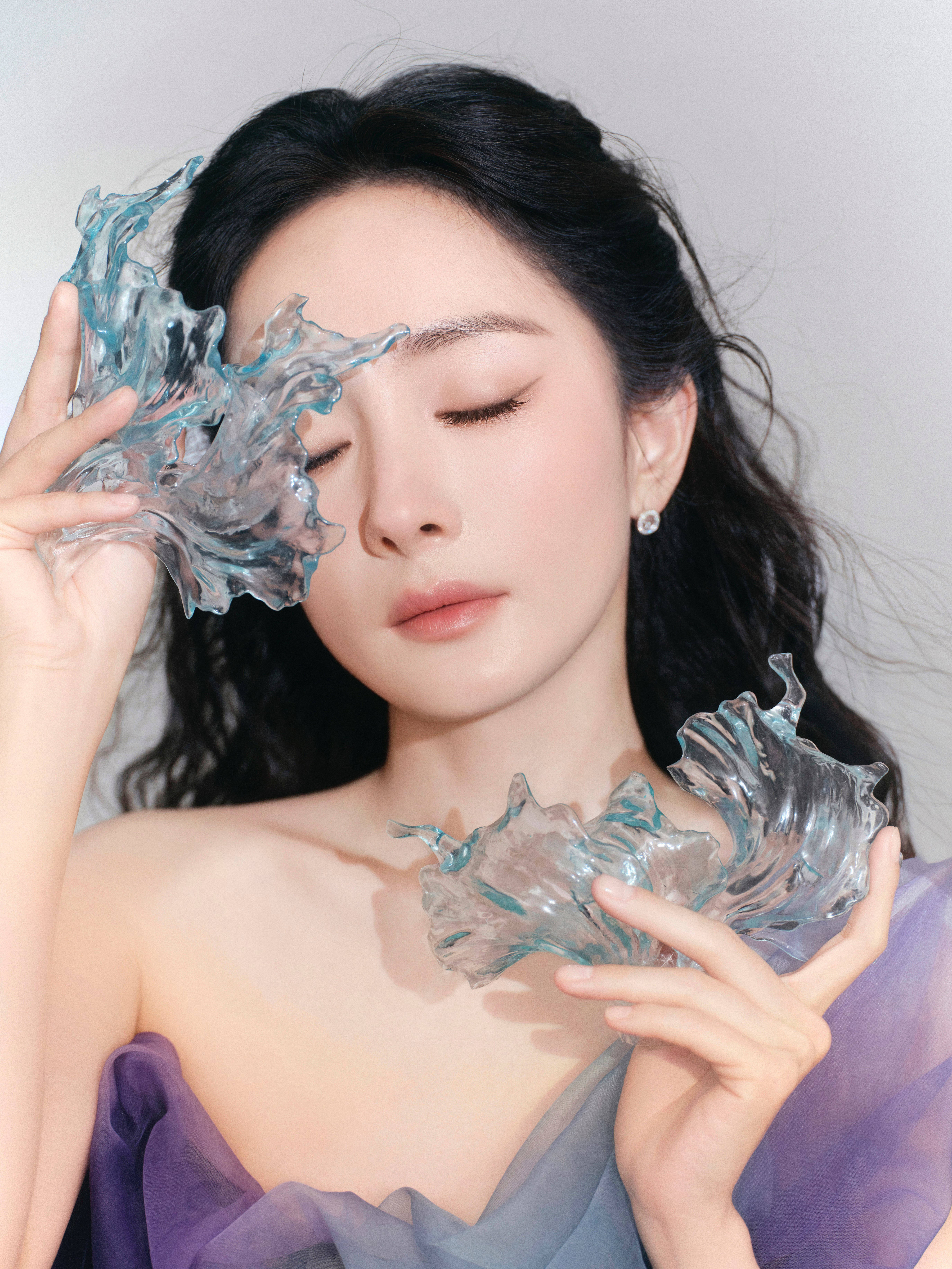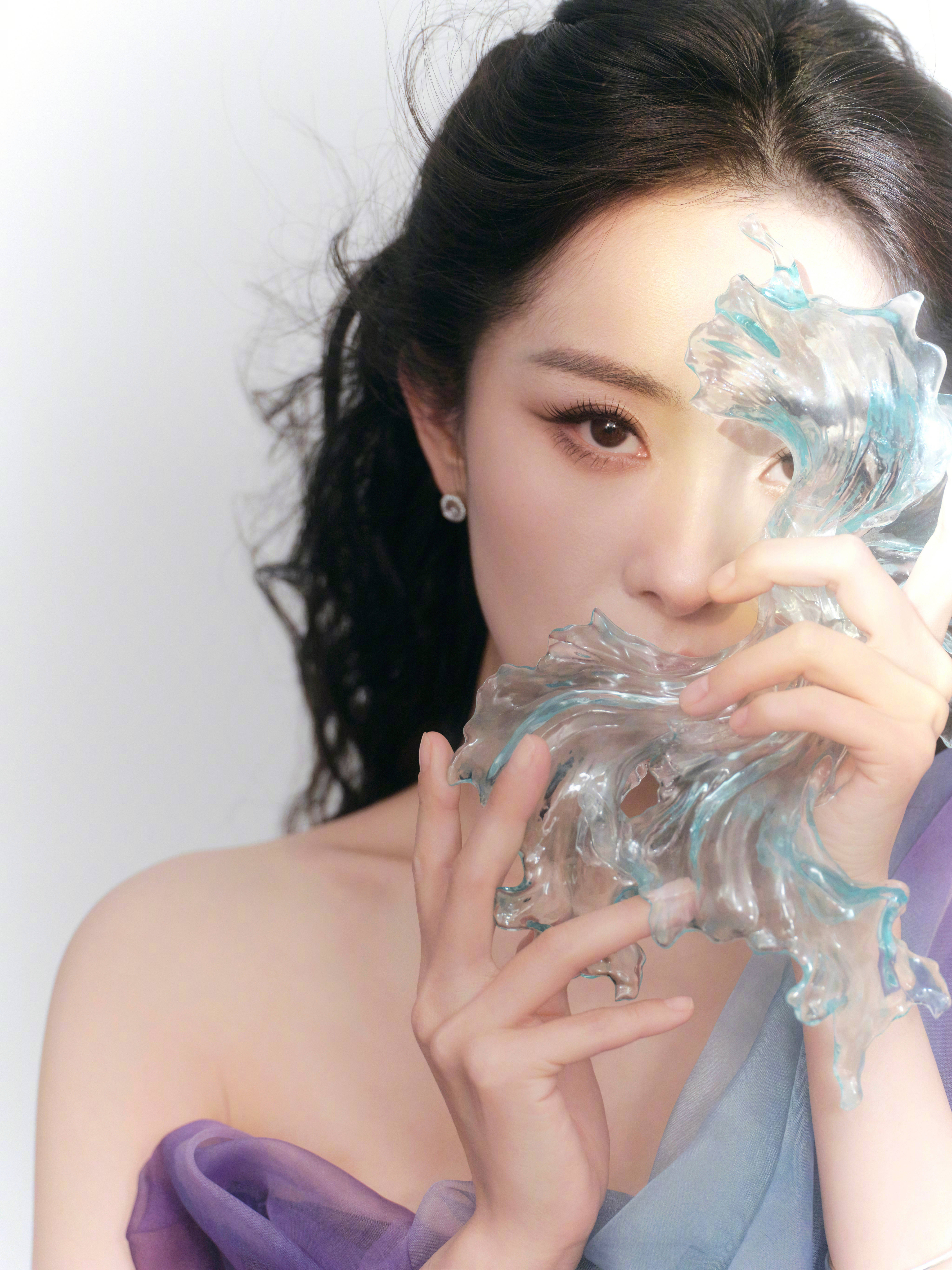 杨幂用透明道具挡住一只眼睛,散发甜美诱惑。