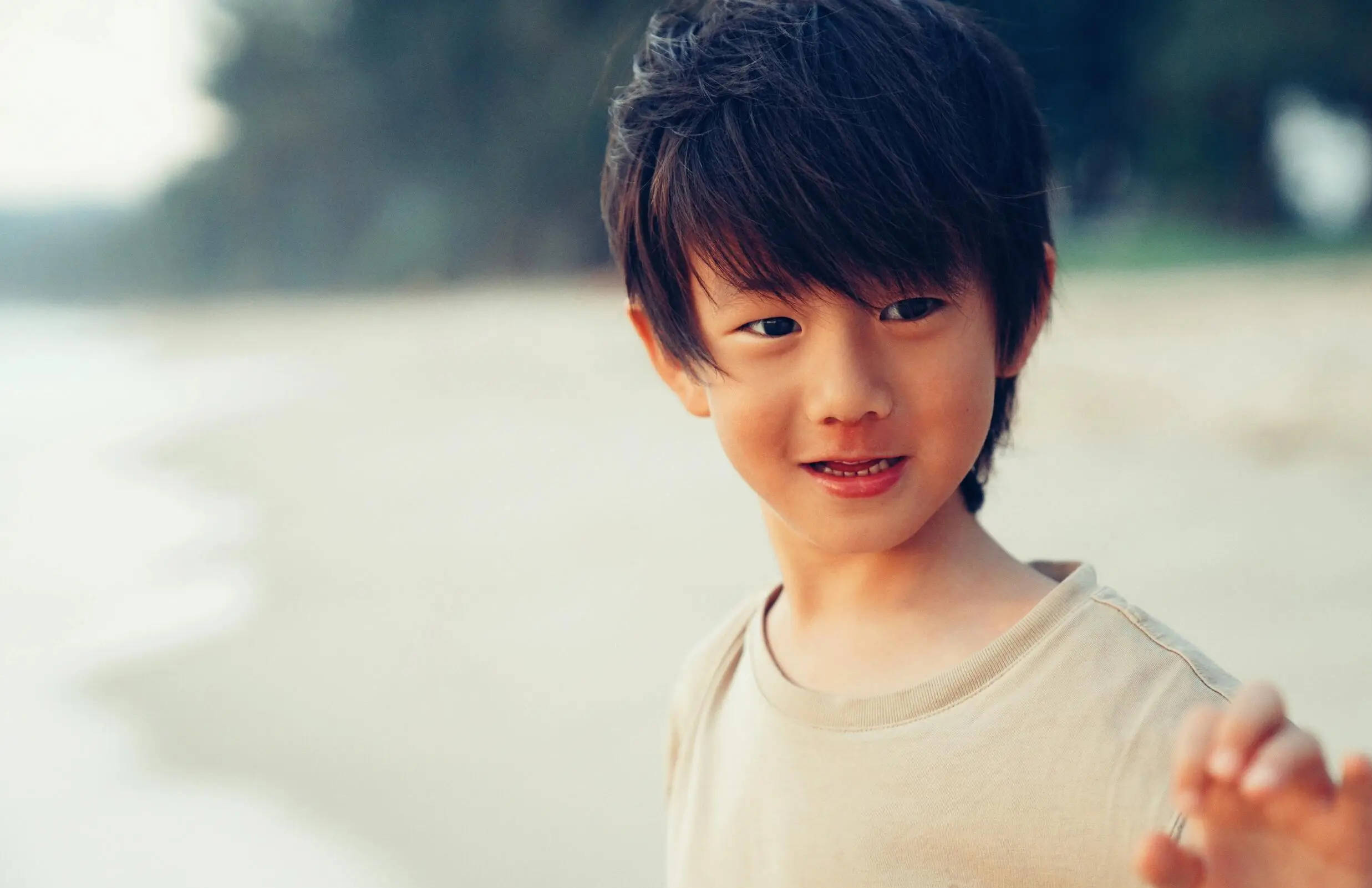 孙莉黄磊的小儿子在海边看夕阳西下。