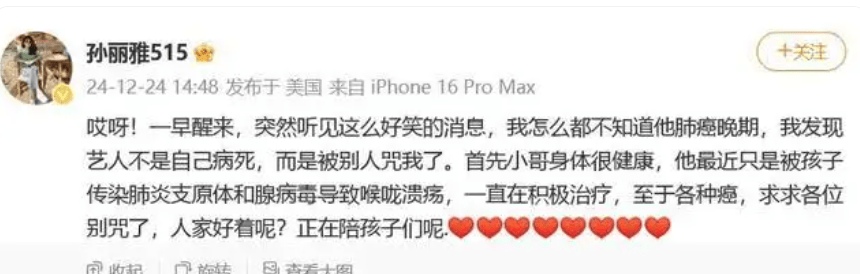 此前,齐秦的妻子孙丽雅也迅速作出回应,发布了详细的辟谣声明。她明确表示,齐秦并非如传言所说的处于肺癌末期这般严重的状况,只是喉咙溃疡而已。而且,齐秦已经在积极接受治疗,目前病情稳定,正在逐步恢复中。孙丽雅写道:“突然听见这么好笑的消息,我怎么都不知道他肺癌晚期,我发现艺人不是自己病死,而是被别人咒了。首先小哥身体很健康,他最近只是被孩子传染肺炎支原体和腺病毒导致喉咙溃疡,一直在积极治疗,至于各种癌,求求各位别咒了,人家好着呢?正在陪孩子们呢。”