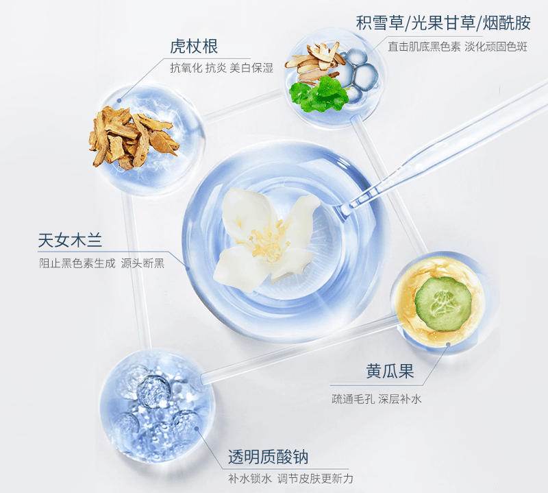 它精选烟酰胺、天女木兰等十余种植萃精华,有效抑制酪氨酸酶活性,阻断黑色素形成,加速代谢已形成的黑色素,进一步淡化色斑。