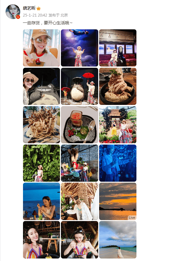 1月21日是农历的腊月廿二了,这也意味着年味越来越浓了,当天晚上,唐艺昕也在个人的社交平台上分享了一组十八宫格的美照,并为此配文:“一些存货,要开心生活哦~ ”,这也受到了网友们的广泛关注。
