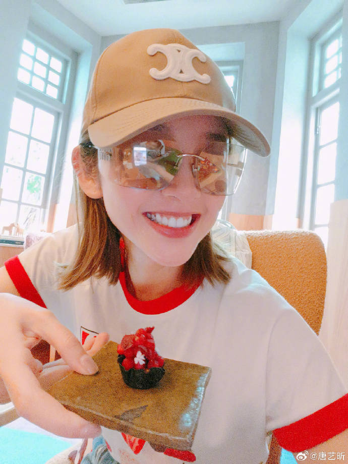 唐艺昕穿着红白配色的休闲 T 恤,头戴卡其色的棒球帽,搭配透明反光墨镜,整体造型简约又不失潮流感。她笑起来的时候也露出了洁白整齐的牙齿,隔着屏幕也能感受到她的开心,这笑容也特别有治愈力,这也难怪张若昀始终对她宠爱有加了。