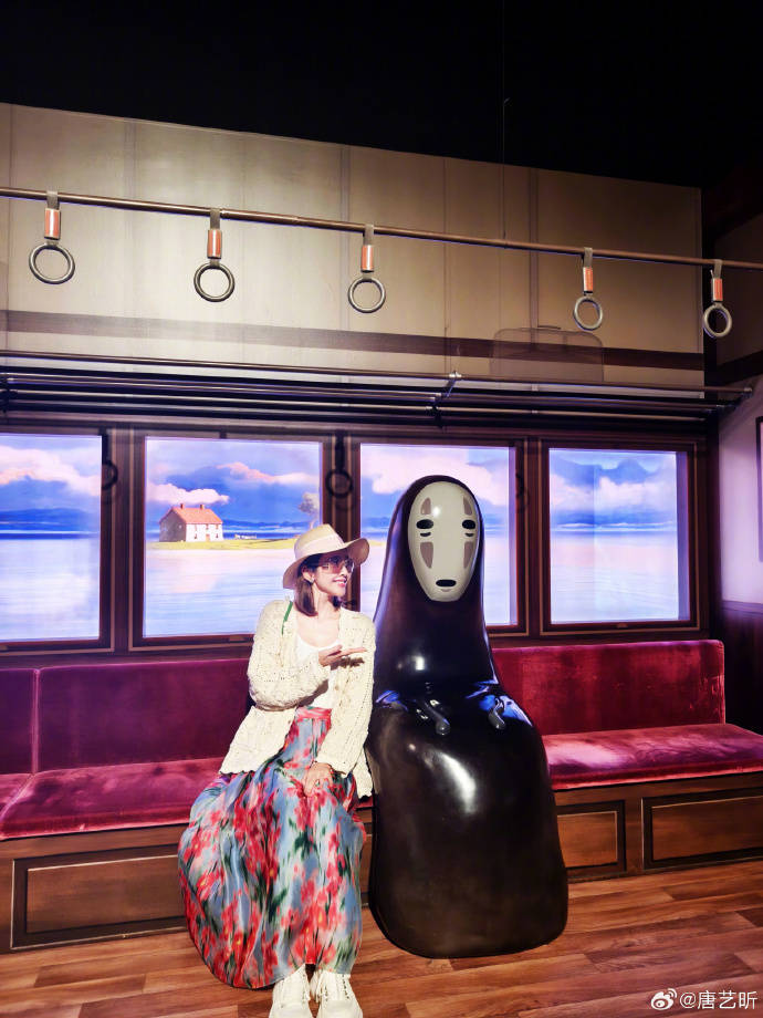她身着白色针织开衫搭配色彩斑斓的印花长裙,脚蹬白色鞋子,整体造型文艺又清新。唐艺昕时而与无脸男、时而与龙猫合体凹造型,整体场景温馨且富有感染力,让人瞬间沉浸在宫崎骏动画的美好世界中。