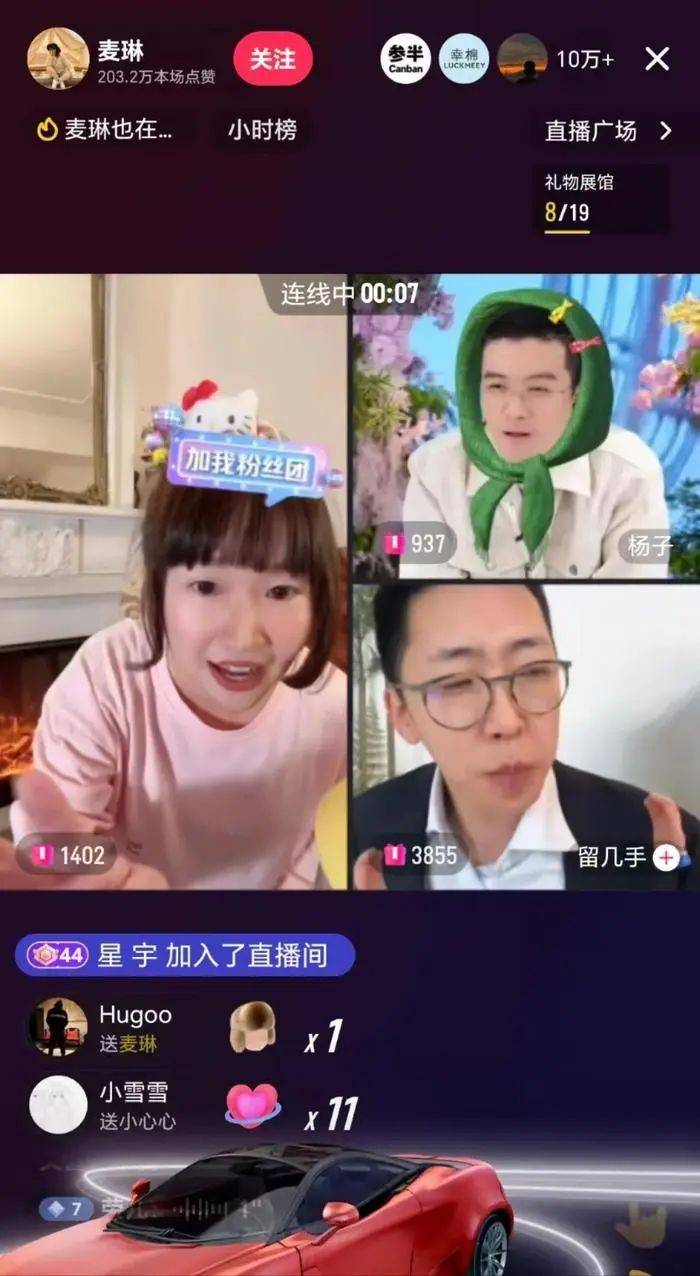而在该活动正式启动前的1月18日,杨子在抖音抢先开播,当晚,留几手、麦琳、葛夕也同步开播,期间,杨子、留几手、麦琳同屏PK,还被不少网友视作再现《再见爱人4》播出时的名场面。根据蝉妈妈数据,当晚,杨子直播间场均观看人次为1393.8万,麦琳、葛夕直播间场均观看分别为889万、576.4万。