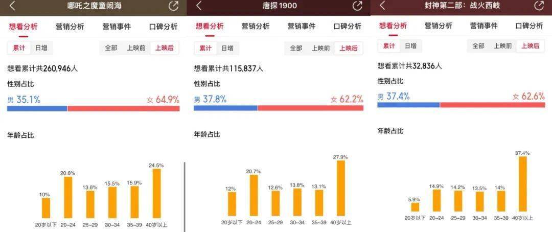 除了“打工人”假期回流至家乡为小城市电影消费带来增长,今年春节档确实有更多观众参与到电影消费中来。猫眼专业版数据显示,多部电影上映后均有大批40岁以上的中年观众表示“想看”,或正因为这部分低频用户加入春节档的购票大军,令到今年春节档总人次刷新了中国影史春节档人次最高纪录。