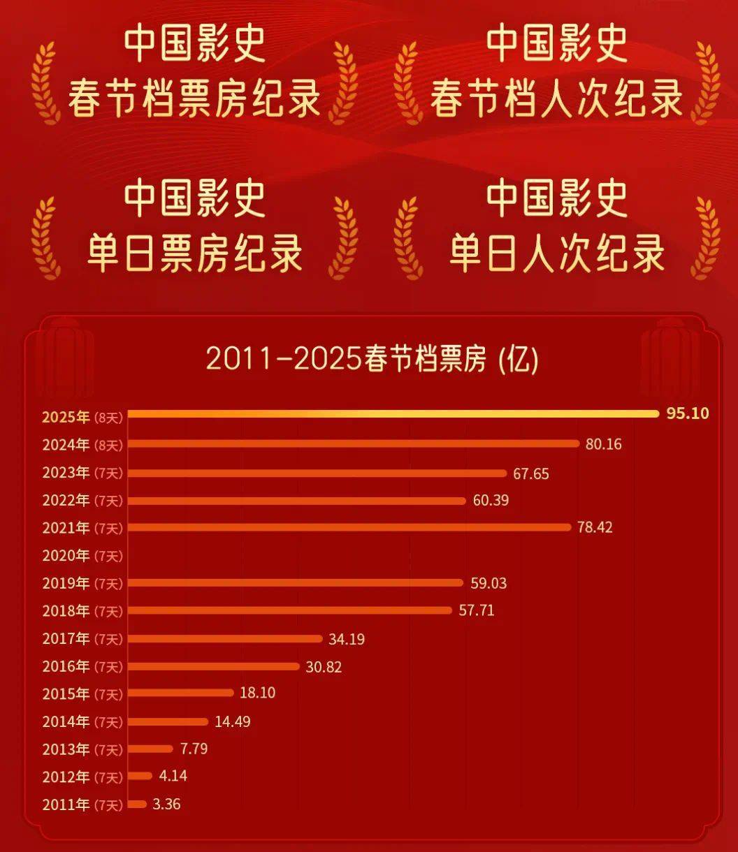 2月3日(大年初六)15时30分,今年春节档电影票房达80.20亿元,超越2024年春节档(80.16亿元)创下新的历史纪录。截至2月5日9时,2025年春节档票房为95.10亿元。