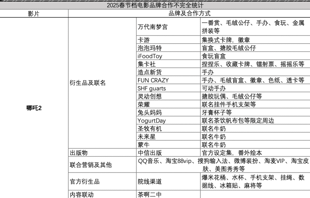 比起《哪吒2》,今年春节档票房TOP 3的《封神:战火西岐》更是“商务王者“。其战略合作多达27个品牌,衍生品及品牌联名超过20家(不完全统计),还尝试了“电影+文旅”、”电影+游戏”联动,商业合作手段形式愈发多样。
