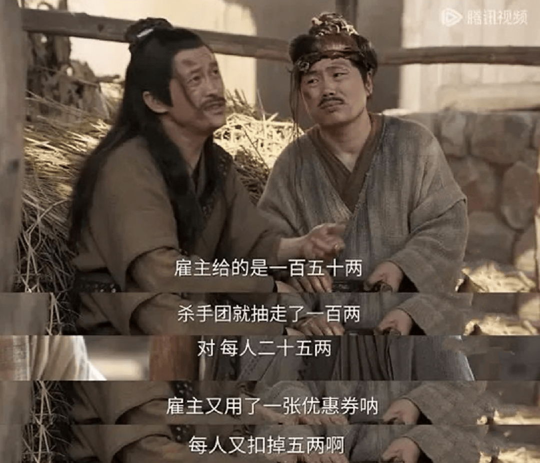 剧中也通过两个刺杀西门长海的杀手,讽刺了平台抽成现象。