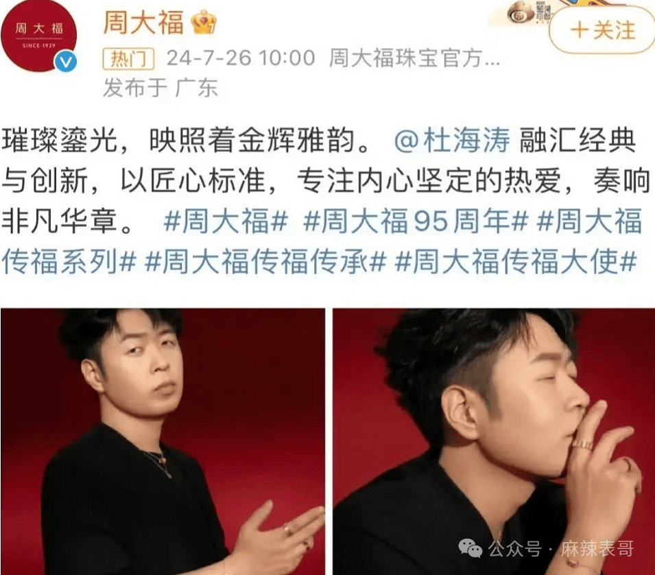 网友发现一件事,杜海涛本是周大福的推广大使,结果周大福把七夕预热微博给删了。