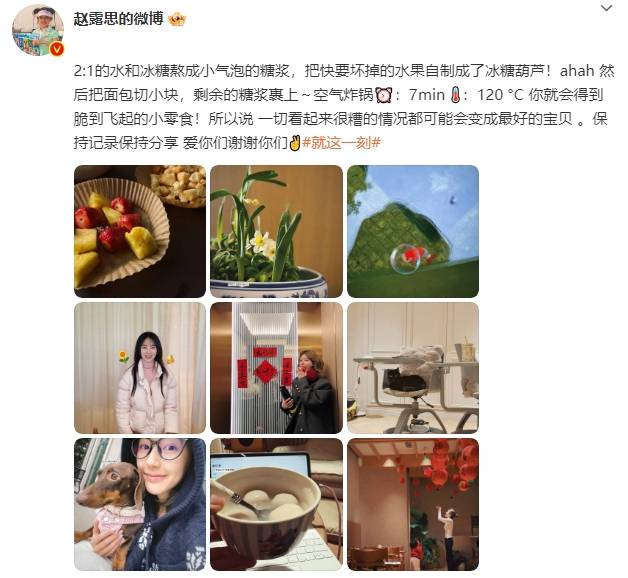 赵露思发文称:“2:1的水和冰糖熬成小气泡的糖浆,把快要坏掉的水果自制成了冰糖葫芦!ahah,然后把面包切小块,剩余的糖浆裹上~空气炸锅定时7min,温度120 °C,你就会得到脆到飞起的小零食!所以说,一切看起来很糟的情况都可能会变成最好的宝贝。保持记录保持分享,爱你们、谢谢你们!”