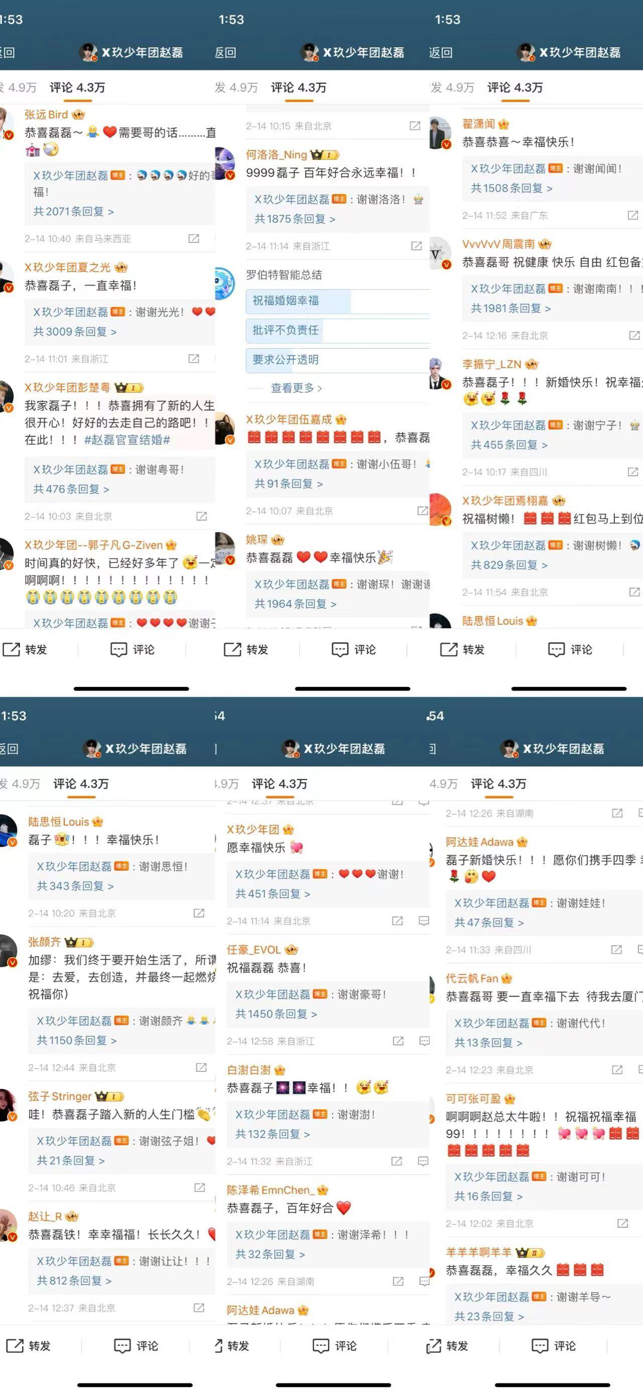赵磊结婚,很多成员送祝福,除了肖战。有成员夏之光、彭楚粤、郭子凡、伍嘉成、焉栩嘉等没看到谷嘉诚和肖战送祝福。其他送祝福的明星还有张远、何洛洛、翟潇闻、姚琛、周震南、李振宁、陆思恒、任豪、代露娃、白澍、陈泽希、阿达娃、代云帆、张可盈、张颜齐、弦子、赵让等。