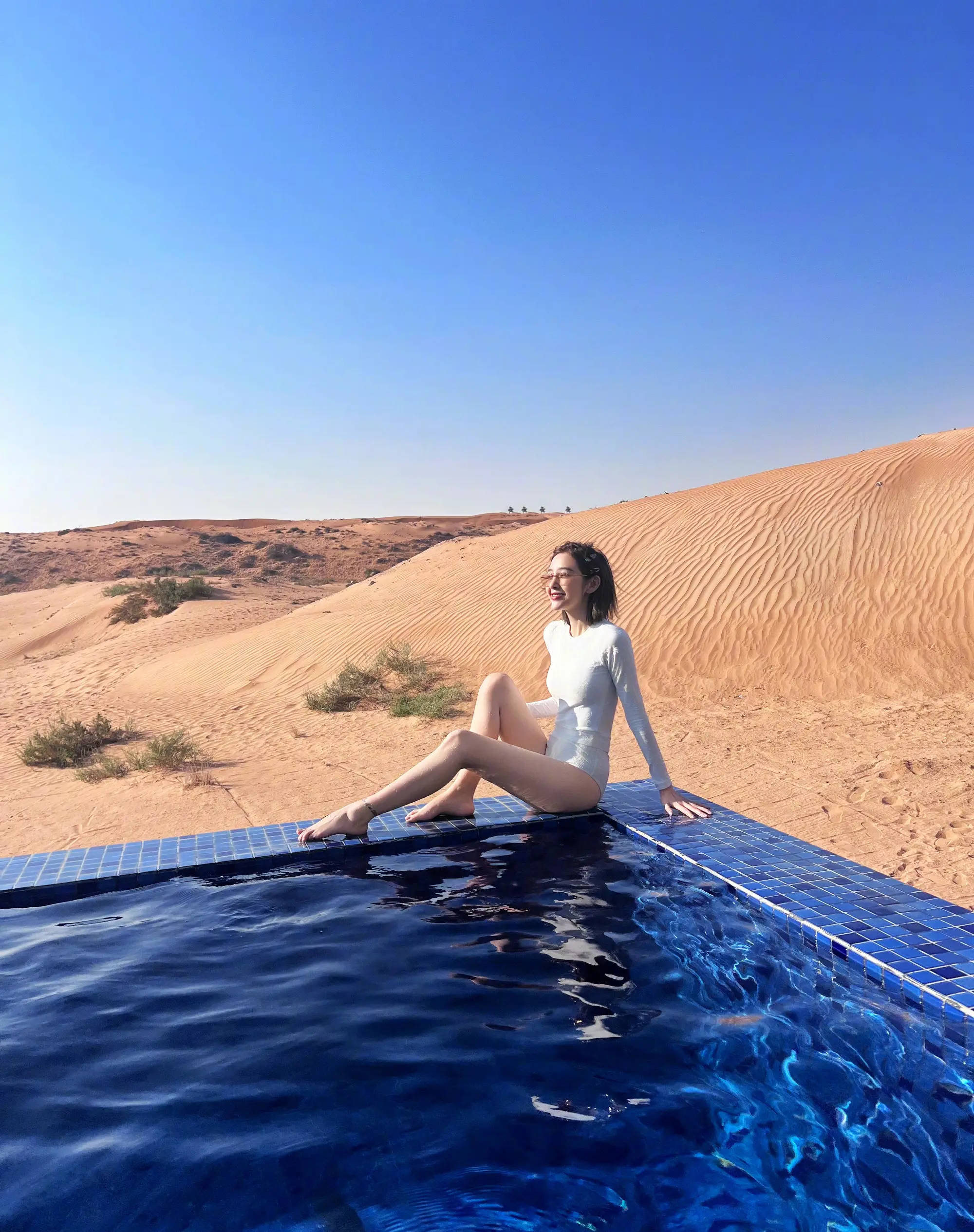 唐艺昕在泳池里戏水,穿黄色泳衣性感靓丽。