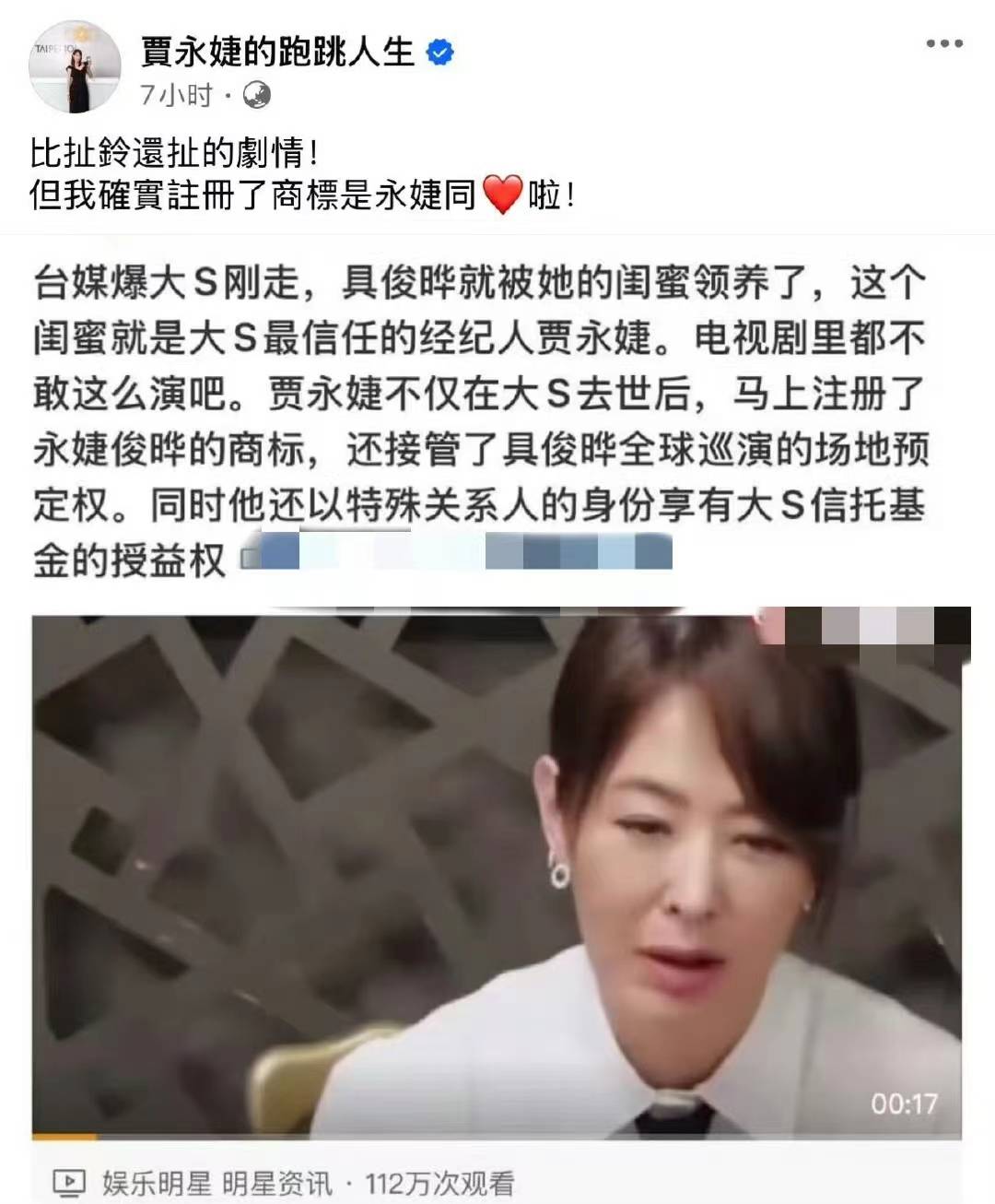 好姐妹贾永婕辟谣,表示自己不会领养具俊晔,传言比扯铃还扯的剧情。大S去世,贾永婕还搭专新干线去送好姐妹最后一程,看到具俊晔吻别大S,被他们俩的深情感动。