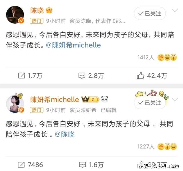 演员陈晓和陈妍希,同步在微博发出离婚声明:“感恩遇见,今后各自安好,未来同为孩子的父母,共同陪伴孩子成长。”简洁的文案更是迅速爆上热搜榜首,阅读量破10亿,占据多条词条,甚至因为突如其来的离婚官宣,直接截爆《难哄》的宣发,引发全网的热议。