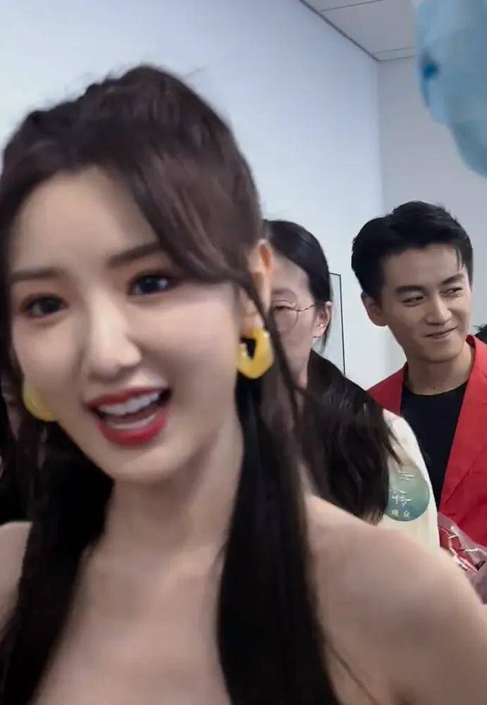 首先比较甜的是一个后台互动,毛晓彤被围观者夸赞“太美了”,走在后头的陈晓嘴角合不拢,笑容藏不住,不知道在暗爽什么?