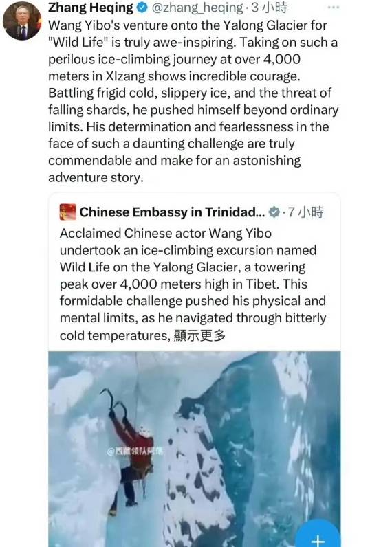 这一事件在海外社媒引发关注,中国驻巴基斯坦大使馆文化参赞兼巴基斯坦中国文化中心主任张和清、中国驻特立尼达和多巴哥大使馆官推等账号点赞发布王一博攀冰视频,并配文:“王一博克服了严寒、冰面湿滑和冰块掉落的风险,将自己推向超越常人的极限。面对如此艰巨的挑战,他的决心和无所畏惧的精神值得称赞!”