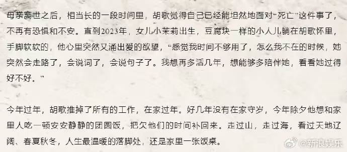 如今,胡歌享受着对死亡的思考。然而,2023年女儿小茉莉的出生,却让他的心态发生了巨大的转变。他开始觉得时间不够用了,他渴望能够多活几年,多陪伴女儿,看着她健康快乐地成长,看着她过得好不好。从对死亡的哲思,到对新生的珍视,胡歌完成了一次心灵的蜕变。