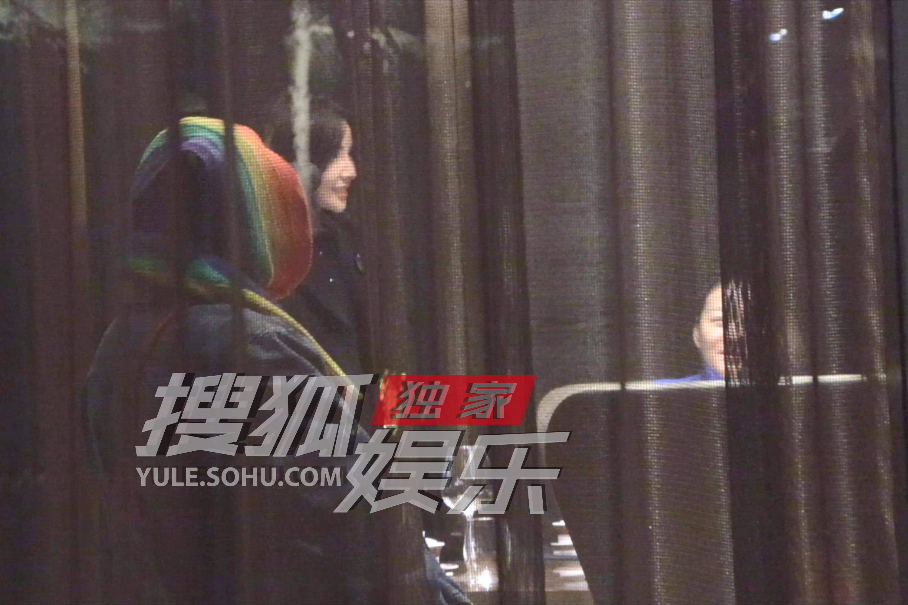 进入包房和朋友见面时,大鹏还依旧保持着七彩头巾造型。