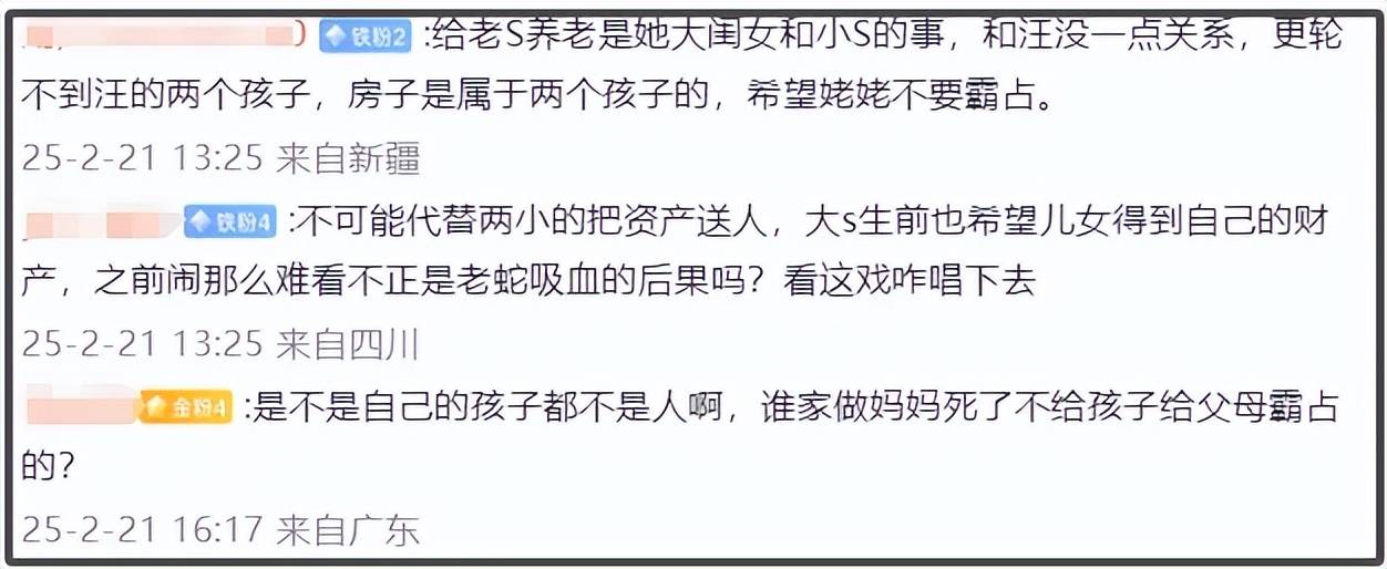 ——所以S妈到底保护了大S啥?保护着保护着,把大S生前买的豪宅保护到了自己名下,在大S离世后没见好好安排她的子女,倒是一心追着前女婿汪小菲要钱。