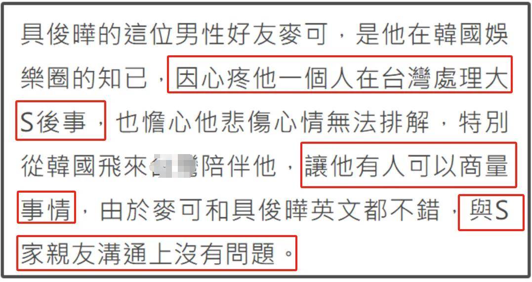 最重要有关大S遗产部分,台娱大佬和业内力挺S妈帮她向汪小菲喊话,具俊晔也有应对,他直接从韩国摇人了,还通过台媒放风向,一边爆料自己暴瘦6公斤很悲伤,一边提到韩国过来的好友英文很好,可以一起和S家沟通,过来协助具俊晔处理大S身后事——这下S家就不能用语言不通把具俊晔排除在外了,毕竟小S二女儿都说自己的母语是英文哦。