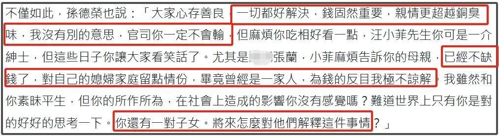 更微妙的是,陈孝志也喊话了汪小菲,和台娱大佬孙德荣表露出的意思几乎一模一样,那就是“孩子带走、钱留下”,希望汪小菲不要再和S家争了,“这一切纷纷扰扰,是时候画上句点了”,几乎就是明示汪小菲只要给钱,S妈就不会开战了。