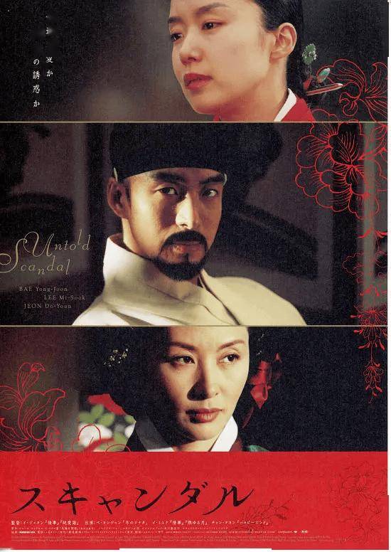 电影《丑闻》由李在容执导,编剧为裴昶浩,裴勇俊、全度妍、李美淑主演,上映后获得了多个奖项的认可。影片以法国小说《危险关系》为灵感,用朝鲜时代为背景进行改编,讲述了一段离奇凄美的爱情故事,涉及上流社会的花花公子、暗恋的堂姐以及守节九年的寡妇等角色。