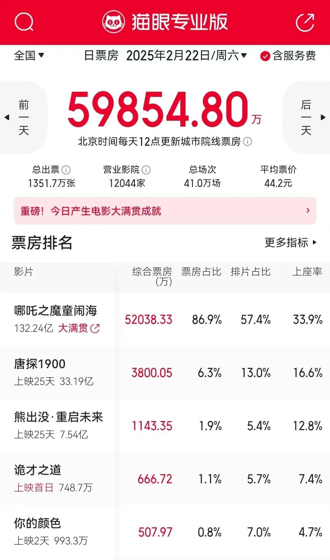 在经历了20多天的“高开疯走”后,《哪吒之魔童闹海》(以下简称《哪吒2》)的单日票房终于在本周有所回落。然而,即便如此它依旧一骑绝尘,牢牢把控着近六成的排片,贡献着近九成的票房。
