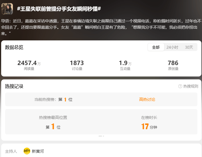 2月22日,微博话题#王星失联前曾提分手女友瞬间秒懂#登上热搜榜第一。