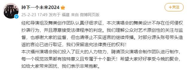 搜狐娱乐讯 近日,十个勤天演唱会官方账号“种下一个未来2024”发文否认抄袭五月天演唱会舞美,称舞美设计不存在任何侵权抄袭行为,并且愿意接受法律程序的判定,对部分造谣言论将取证维权。