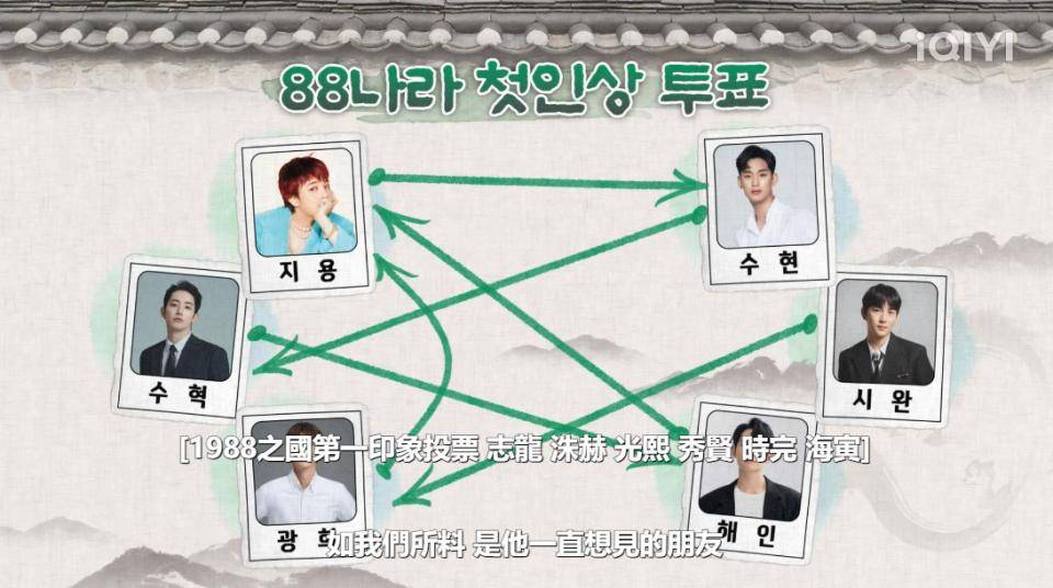 自我介绍结束后就是“第一印象投票!”投票环节!紧接着像恋综模式,公开88Line初见还有自我介绍后的“第一印象投票!”投票环节!没想到竟然有人拿到零票!时完的好感对象,投票给了相当熟悉的光熙,金秀贤则是投票给还不是很熟悉的洙赫,而洙赫也是选了还不熟悉的丁海寅,丁海寅则是选了88Line聚会主办人GD,GD则是选了金秀贤,光熙则是选了GD,全员错开互选,没有一对CP互选!而GD因为拿了2票,其他人各1票,时完则是0票,让他不免感到小失落,不过GD赶快把自己的鲤鱼饼给时完说:其实我选的是你,场面相当温馨和乐融融!而88Line更是抓紧时间互相交换电话等联络信息来增进感情!