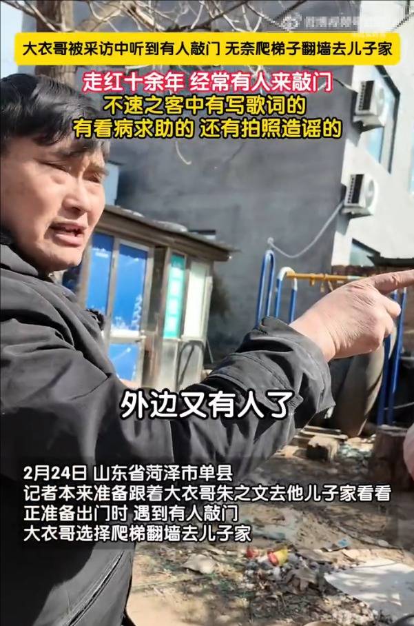 2月24日,山东省菏泽市单县。记者本准备跟着大衣哥朱之文去他孩子家看看,正准备出门时遇到有人敲门, 面对不断有人敲门拜访的压力,大衣哥无奈选择翻墙穿邻居家过去。