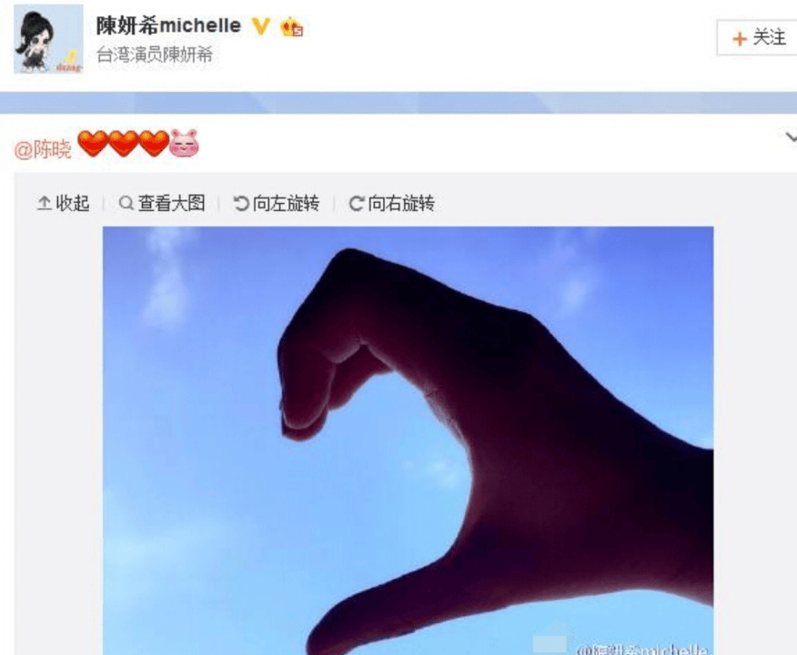 同年8月27日, 陈晓在微博官宣恋情:“总有一天,你会跟我姓。”配图手势比心。陈妍希同样以一个比心的照片转发回复。