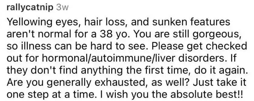 有医护人员在评论区指出,米歇尔眼睛发黄,脱发严重,她依旧拥有美貌,但最好还是去医院检查一下肝脏。