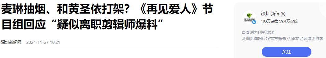 深圳新闻网:麦琳抽烟、和黄圣依打架?《再见爱人》节目组回应疑似离职剪辑师爆料