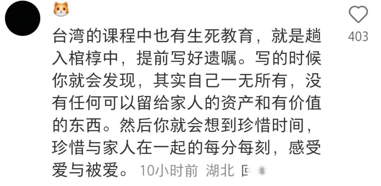 在台湾设置的课程里存在生死教育这一内容,参与其中的人会躺进棺椁,并事先写好遗嘱。在撰写遗嘱时,人们会察觉到,实际上自己并无所有,没有能够留给家人的资产以及具有价值的物品。由此,人们便会萌生出珍惜时间的想法,珍视和家人共处的每一分每一秒,用心去感受爱与被爱。