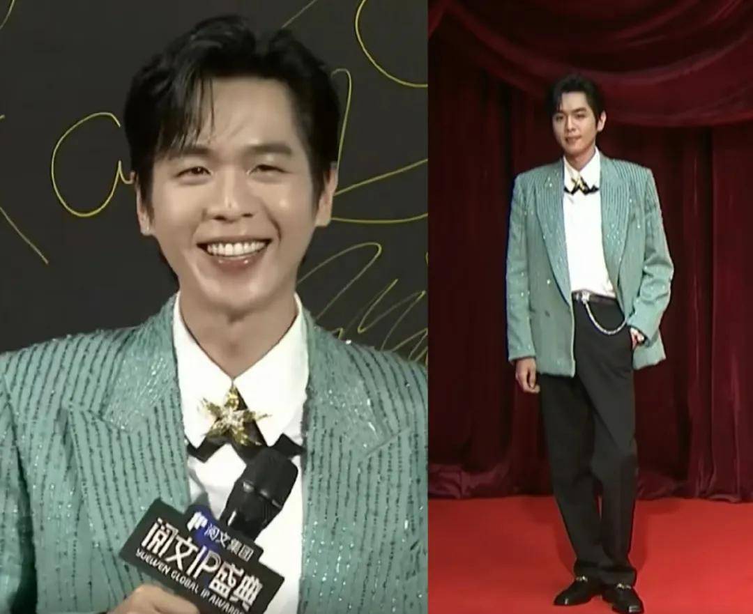 张若昀是男明星中唯一穿了亮色西服的,也许是因为他太瘦了,也许是因为西装外套过于宽松,无论外套还是裤子看着都不太合身。