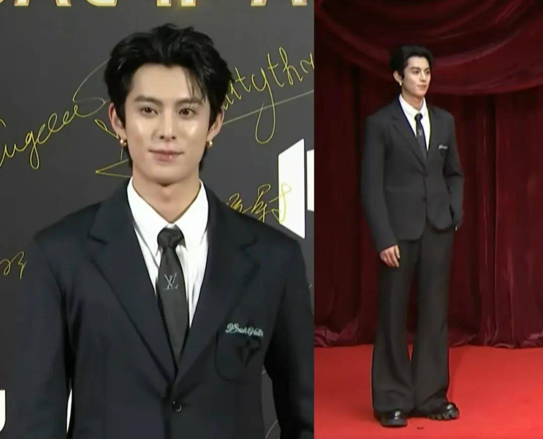 王鹤棣也穿了黑色西服,不过他的搭配是阔腿西装裤和厚底鞋,上半身看着很正式,下半身却很休闲。