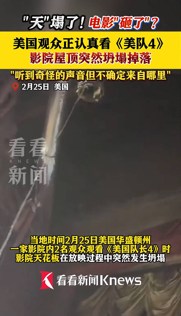 当地时间2月25日,美国华盛顿州发生一起意外,2名观众在观看《美国队长4》时,电影院的天花板在放映过程中突然发生坍塌。(来源:看看新闻Knews)