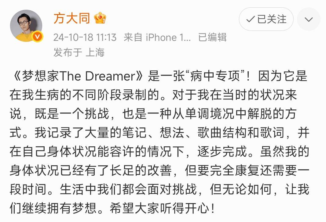 记得在《梦想家》刚发布的时候,方大同还透露了自己的身体状况:
