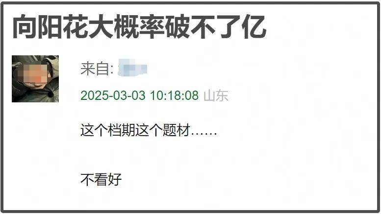 本就是冷档上映,再加上角色设定新意不足和《乔妍的心事》的口碑影响,这让《向阳·花》本就引人担忧的票房成绩雪上加霜,有网友直接唱衰票房,觉得《向阳·花》不仅没办法超过《乔妍的心事》取得的1.5亿票房,甚至还有可能连1亿票房都没办法突破。