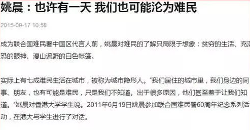 而网友说,姚晨还站在美国的立场上,呼吁中国接收难民。