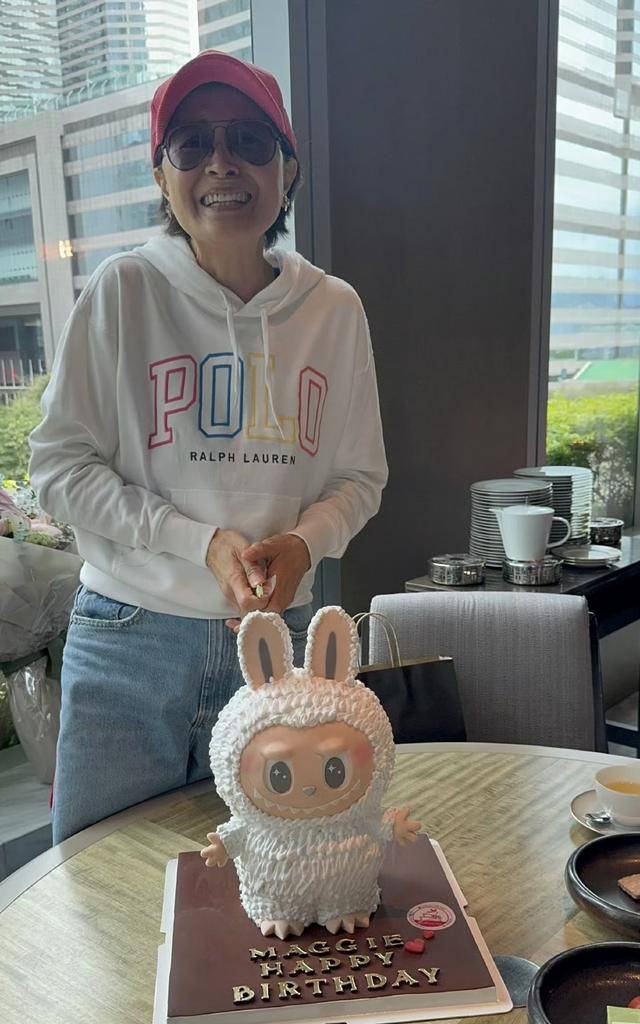 有留意蛋糕的网友一定清楚,这个卡通人物是近期比较流行的,难怪邵美琪看后也是爱不释手,与其进行互动之余,还不忘做出鬼马的表情与之合照。