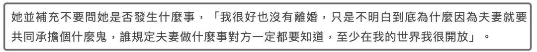 突如其来的声明让不少人以为萧淑慎和老公闹了矛盾,但萧淑慎却说,自己没有离婚,只是不明白到底为什么因为是夫妻关系就要共同承担责任,也不知道是谁规定夫妻做什么事对方一定都要知道,在萧淑慎看来,至少在她这,她的思想很开放,言外之意,丈夫做什么事情自己可以不管不问,也没必要都知道。