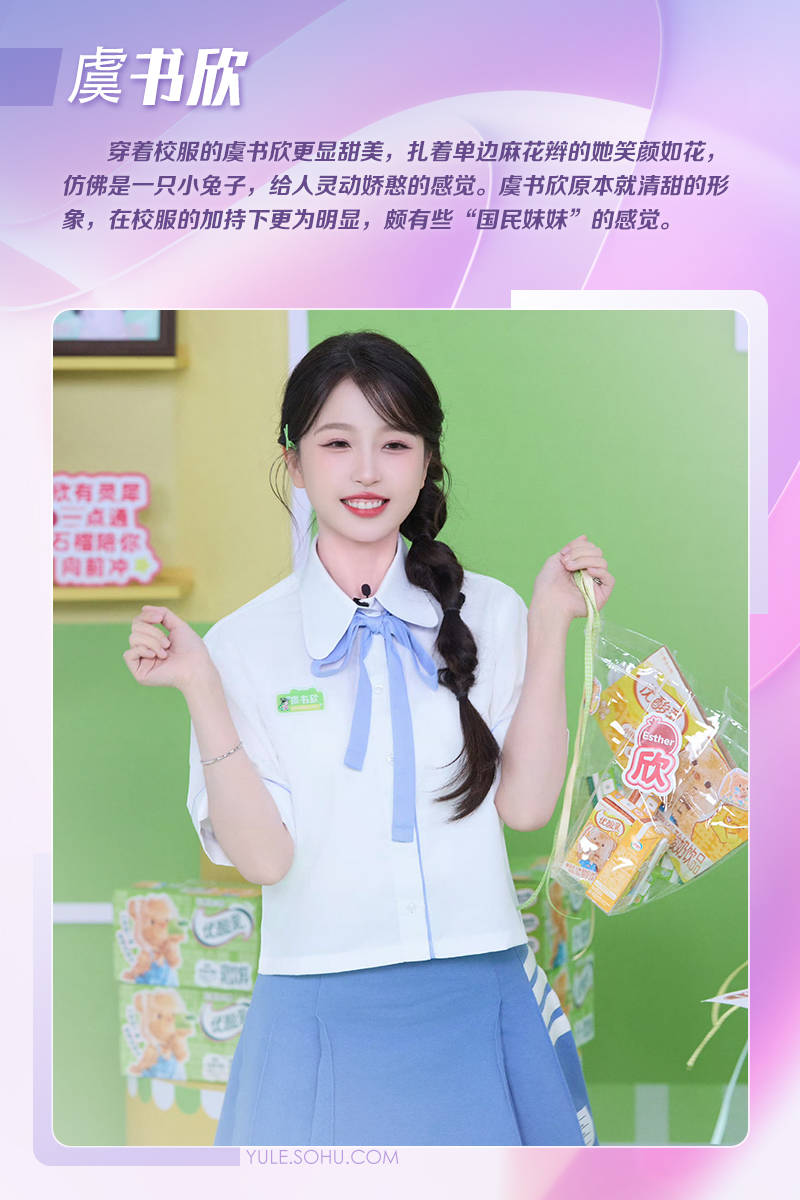 虞书欣曾在直播中以校服造型亮相,扎着单边麻花辫的她笑颜如花,表情娇憨可爱,仿佛化身娇嗔小兔子,一举一动都惹人怜爱。