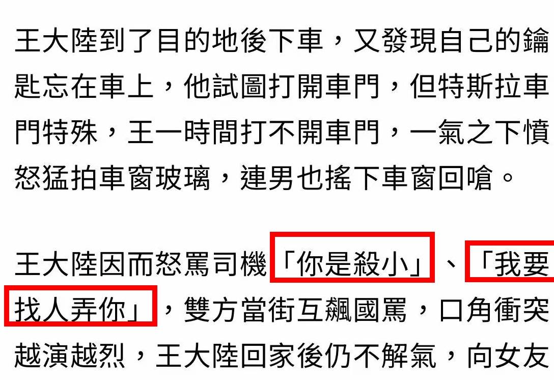 王大陆乘坐的是一辆特斯拉,他上车后认为司机绕路,在搭乘途中多次“碎碎念”,特斯拉司机也不甘示弱,两人有小冲突。